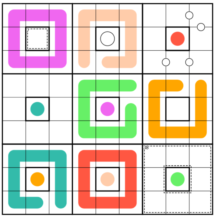 Irregular sudoku rules apply: Each row, column, and region contains each digit 1-9 exactly once. Each region consists of an 8-cell “doughnut” and the “doughnut hole” with the matching “glaze.” The marking of the doughnut hole simply shows which region it belongs to; doughnut holes are not constrained by line type.