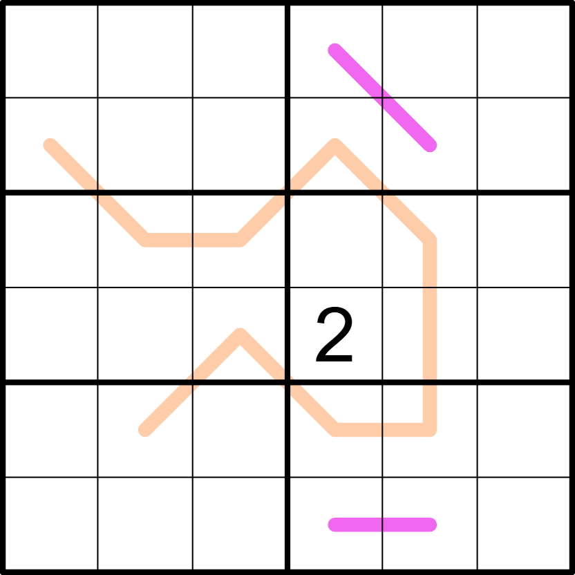 Every set of three adjacent cells along a peach entropic line must contain a low digit (1-2), middle digit (3-4) and high digit (5-6).