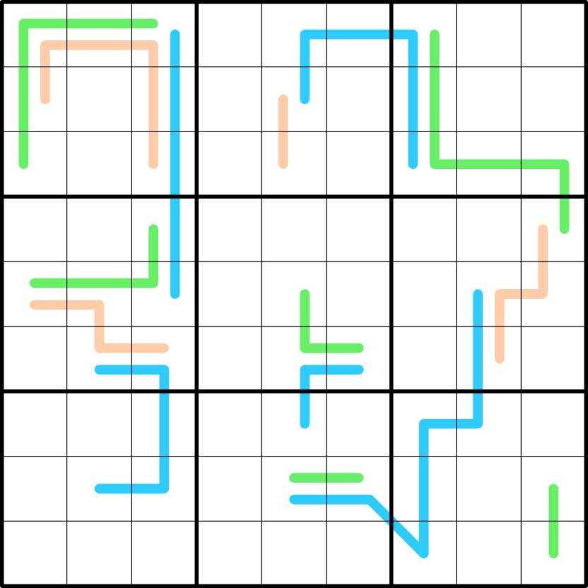 Region Sum: Blue lines are segmented by box borders. Each segment must have the same sum. Sums may be different for each blue line.