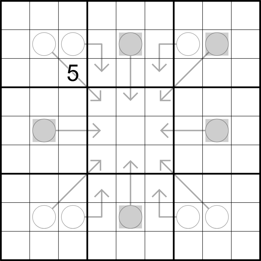 - Arrows: Digits along an arrow sum to the digit in the connected circled cell. Digits may repeat on an arrow if allowed by other rules.