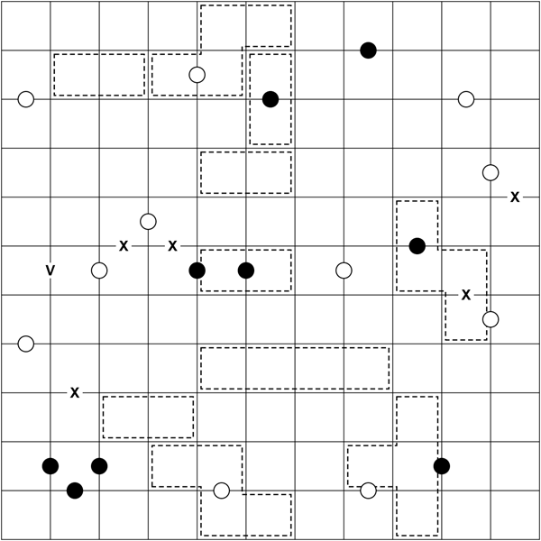 Kropki dots: A black dot between cells indicates cell values with a 2:1 ratio. A white dot between cells indicates cells with consecutive values. Not all dots are shown.