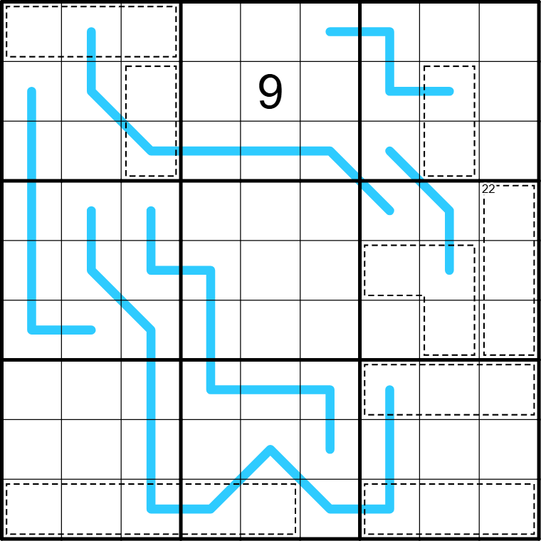 Digits in cages sum to the total in the top left hand corner if given. If no total is given, cages sum to the segment sum of the region sum line going through them.