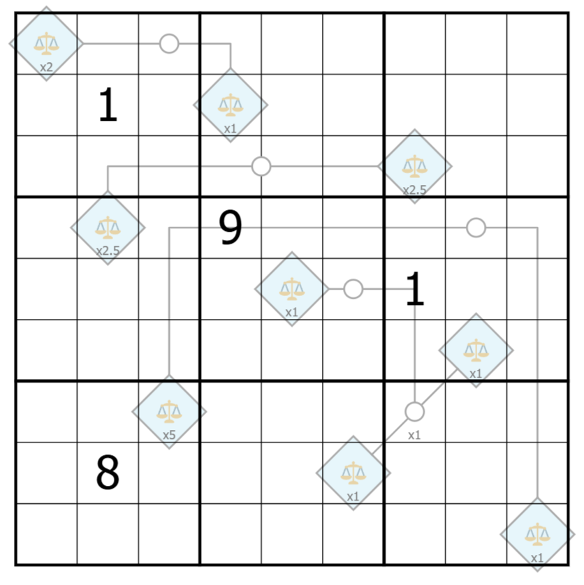 Where one scale hangs from another, the weight of the hanging scale is the sum of any weights attached to it, centered at the hanging fulcrum. Specifically in this puzzle, this means that the weight of r5c5 must be equal to the sum of the weights of r6c8 and r8c6.