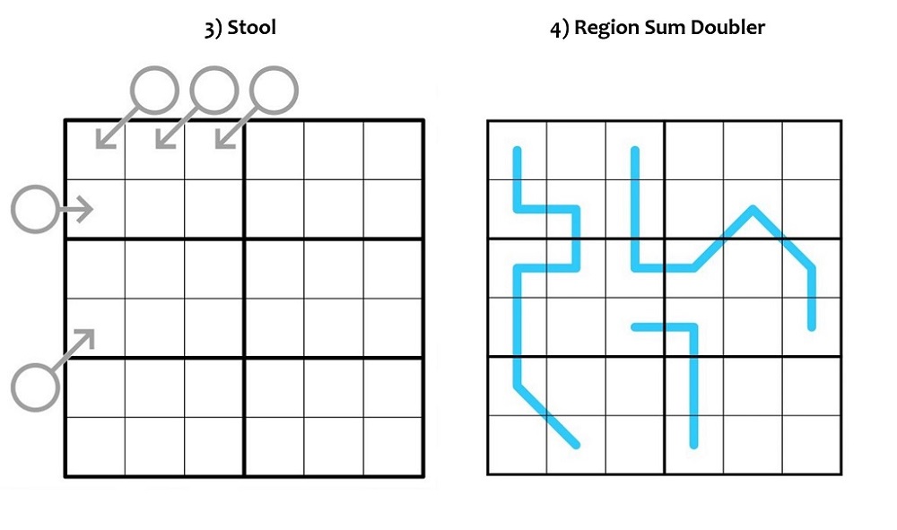 ● Jede Reihe, Spalte und Box enthält einen Doubler. Für die Zwecke der Region Sum Lines zählt die Ziffer in einem Doubler doppelt. Jede Ziffer erscheint genau einmal in einer solchen verdoppelten Zelle.