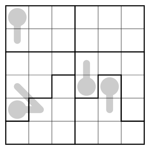 Irregular 6x6 sudoku rules apply. Place the digits 1 - 6 once in every row, column and bold outlined region.