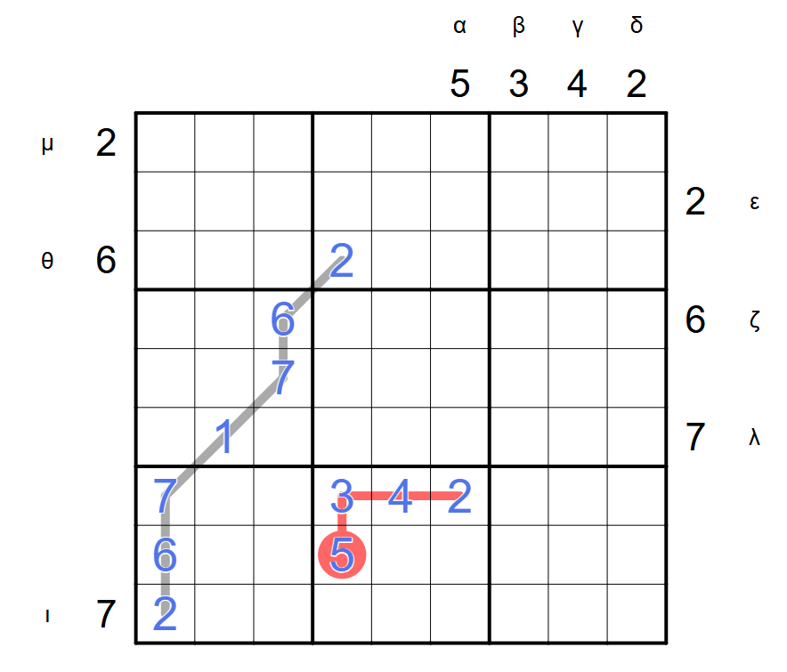 Disguised digits: Digits outside of the grid have disguised themselves as Greek letters. Each digit has disguised itself as a unique letter, even if that digit is not unique. (For example, you might find that both λ and δ represent the digit 4)