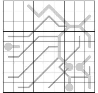 PALINDROME (thin grey lines): Digits along a palindrome line must read the same forwards and backwards. (Note: the palindrome starting at Row 4 Column 1 ends on Row 3 Column 7.)