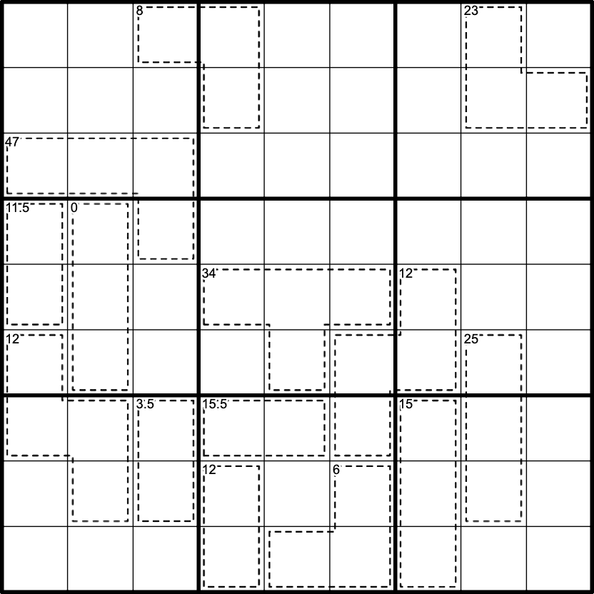 Killer: Digits cannot repeat in a cell and the values sum to the given clue.