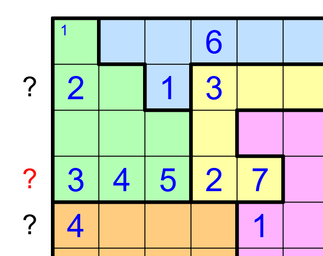 - In row 4 with a red clue, the 3 and 2 give the extents of those first two regions in the row. As the clue is a question mark, 3+4+5=12 and 2+7=9 may have different sums.