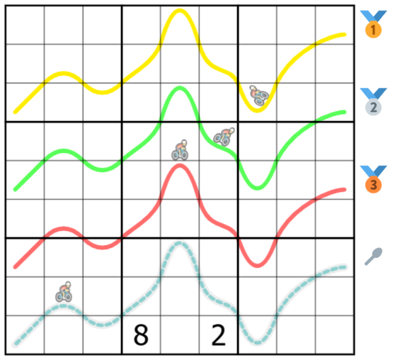 Each line in the grid represents the path of a different rider. Riders earn 1 point for every odd digit on their path. Digit in a cell with a rider indicates the amount of points earned by that rider. The Red rider (R4C5) doesn't share a cell with its line.
