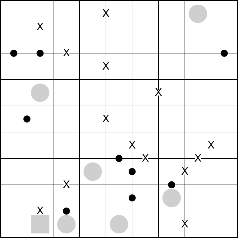 Cell connected by an black dot must be in a 1:2 ratio (One double the other).