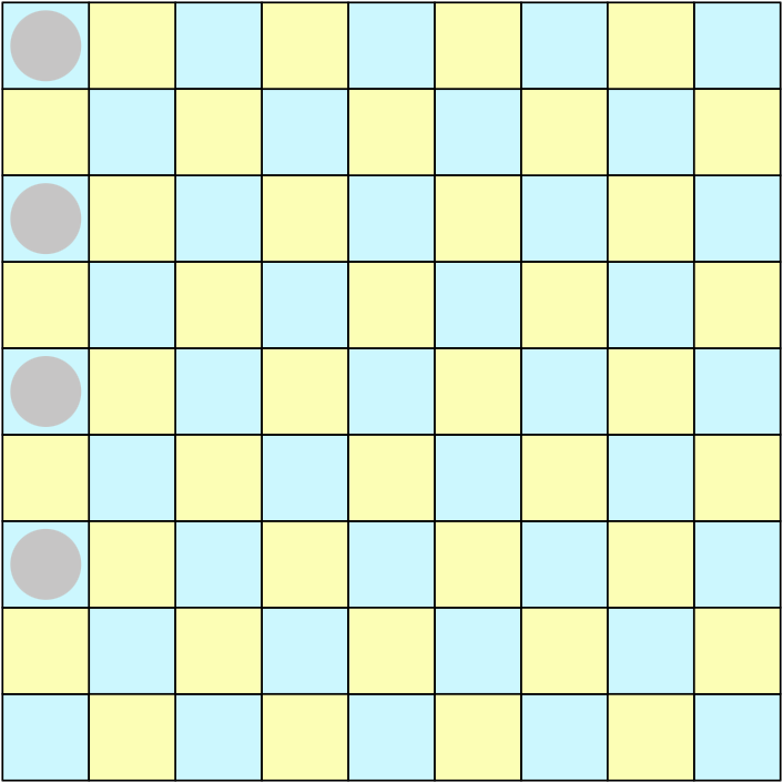 Parity Parity: The grid is covered in a checkerboard pattern of yellow and blue cells. Each digit appears in one of the colors exactly as many times as its value. For example, 7 will appear either exactly seven times in blue or exactly seven times in yellow.