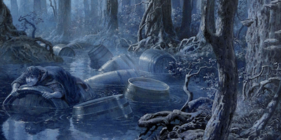 Out they went under the overhanging branches of the trees on either bank. Bilbo wondered what the dwarves were feeling and whether a lot of water was getting into their barrels. Some of those that bobbed along by him in the gloom seemed pretty low in the water, and he guessed that these had dwarves inside.