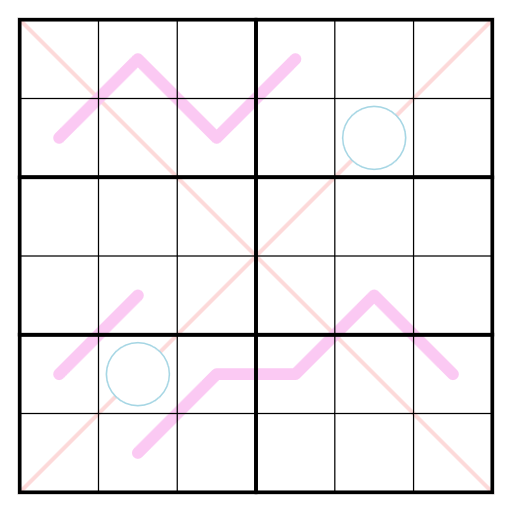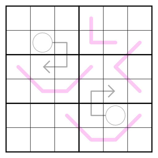 - Es gelten die normalen 6x6-Sudoku-Regeln, d.h. jede Reihe, Spalte und 2x3-Region muss die Zahlen von 1 bis 6 enthalten.