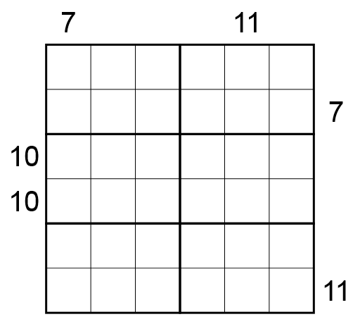 - Periodic Sums: Ein Hinweis außerhalb des Gitters zeigt die Summe von N und jeder N-ten weiteren Ziffer in der Reihe oder Spalte an, wobei N die erste vom Hinweis aus gesehene Ziffer ist. Enthält zum Beispiel r1c1 eine 2, so müssen sich die Ziffern in r1c1, r3c1 und r5c1 zu 7 addieren.