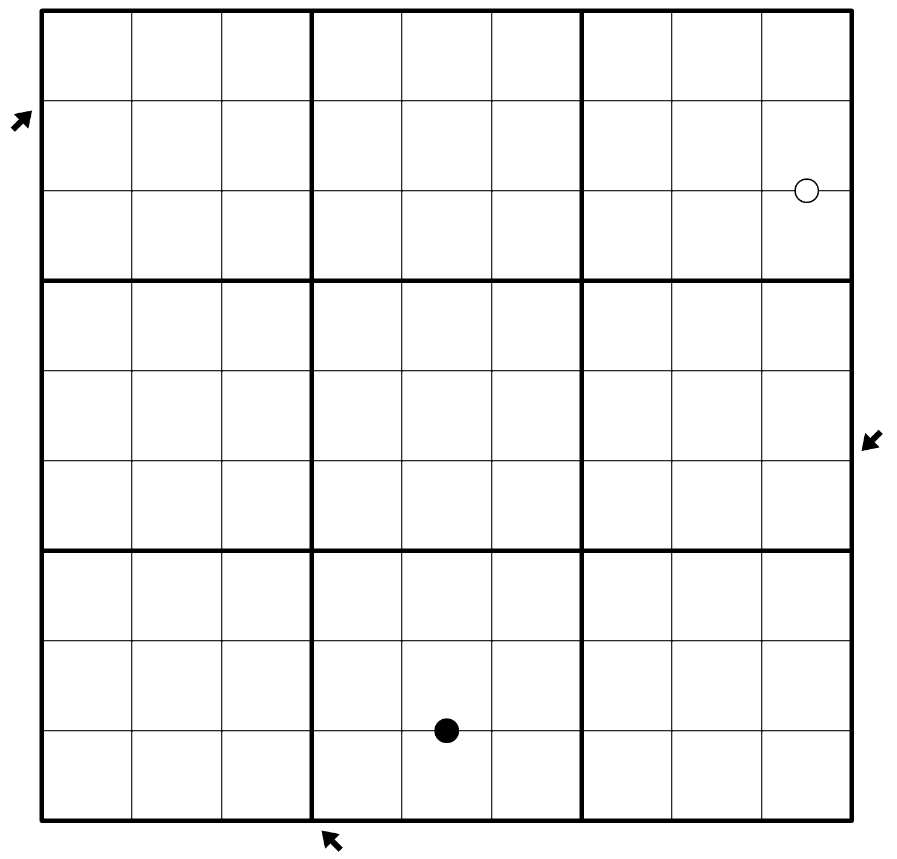 Ein Pfeil außerhalb des Rätsels zeigt an, dass die Hinweise „X-Summe“, „Sandwich“, „Wolkenkratzer“ und „Kleiner Killer“ an dieser Stelle identisch sind. Zellen, die durch einen weißen Punkt verbunden sind, enthalten aufeinanderfolgende Werte. Zellen, die durch einen schwarzen Punkt verbunden sind, enthalten Werte, bei denen der eine doppelt so groß ist wie der andere. Nicht alle Punkte werden angezeigt.