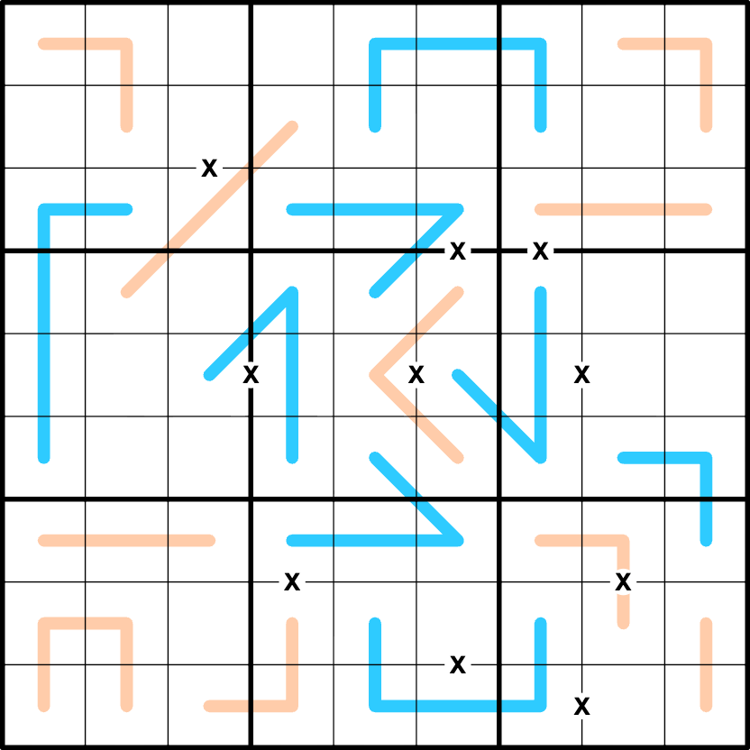 Cells separated by an X must sum to 10.