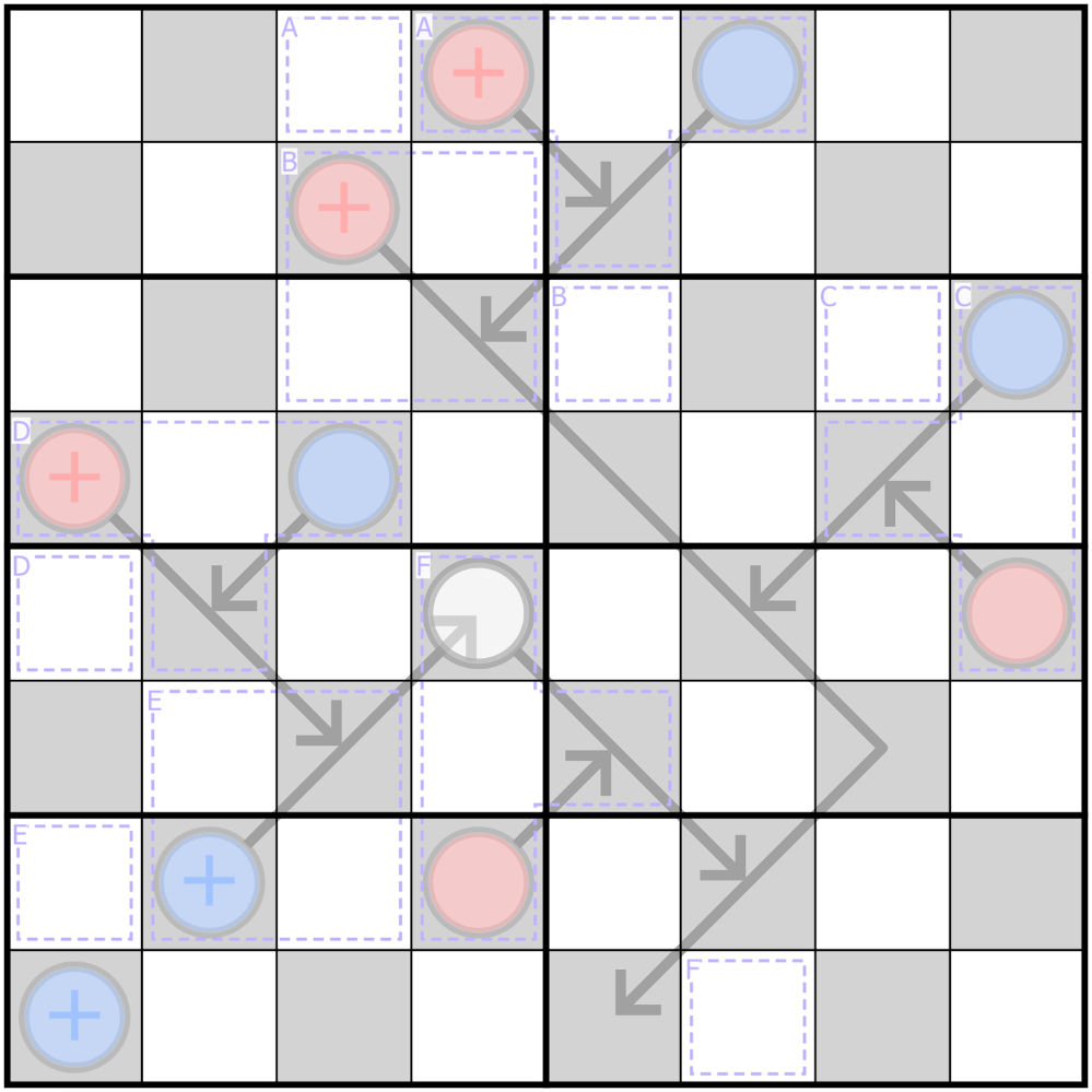 • Käfige (Spielreihenfolge). Das Brett ist zum Teil in sechs 4-Zellen-Käfige (von A bis F), die jeweils eine oder mehrere Figuren beinhalten, und in entsprechende 1-Zelle-Käfige aufgeteilt. Die Ziffer in einem solchen 1-Zelle-Käfig gibt die Reihenfolge (von 1 bis 6) an, in der die Spielzüge gemäß den angegebenen Pfeilen gespielt werden müssen, z.B. falls Zone A zuerst gespielt werden sollte, dann B und sagen wir F als letzte Zone, dann müsste 1-Zelle-Käfig A die Ziffer 1 enthalten, B die Ziffer 2 und F die Ziffer 6.