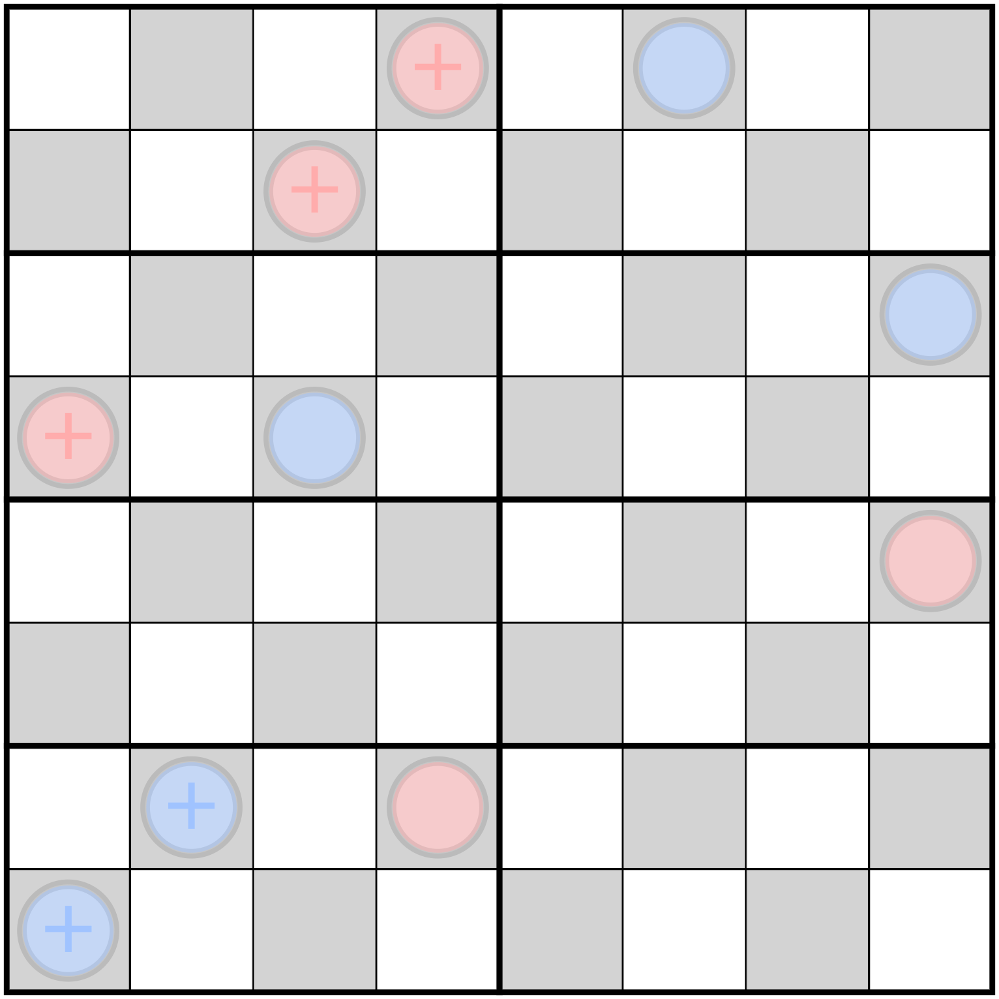 • Sudoku. Es gelten die üblichen 8x8 Sudoku-Regeln.
