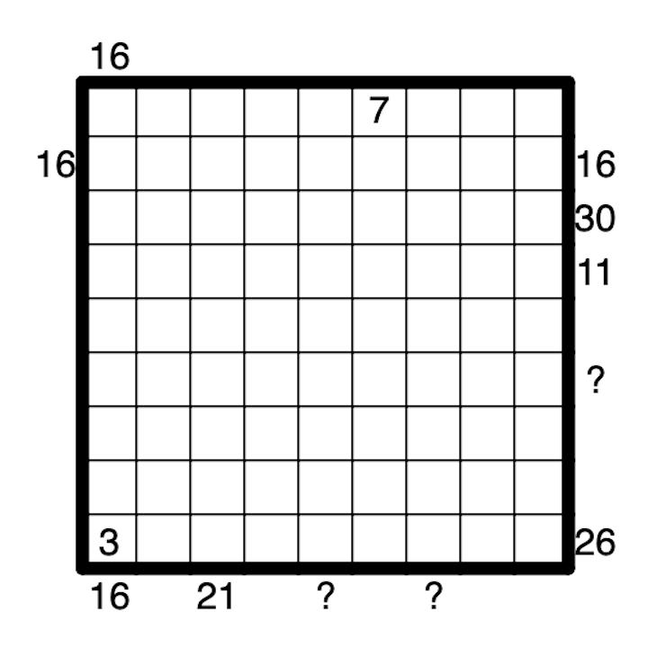 A clue outside the grid can mean one of two things, as written below. A question mark indicates a nonzero, positive valued number.