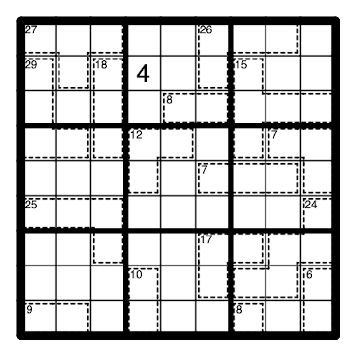 An area outlined by dashes is called a killer cage. All numbers in a killer cage are different and sum to the number in the top left corner of the killer cage, if given.