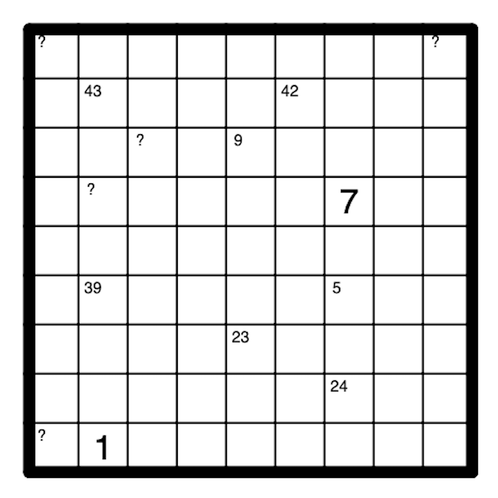 'A digit X in a cell containing a number N in its top left corner indicates that cell sees X digits in its region and that those digits sum to N, where region borders obstruct vision. A question mark can be any positive integer.'