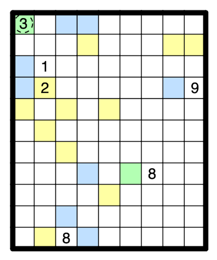 A number in a yellow cell indicates how many of the cells in the surrounding 3x3 area belong to snake A. A number in a blue cell indicates how many of the cells in the surrounding 3x3 area belong to snake B. A green cell behaves as both a yellow cell and a blue cell. All colored cells are nonempty.