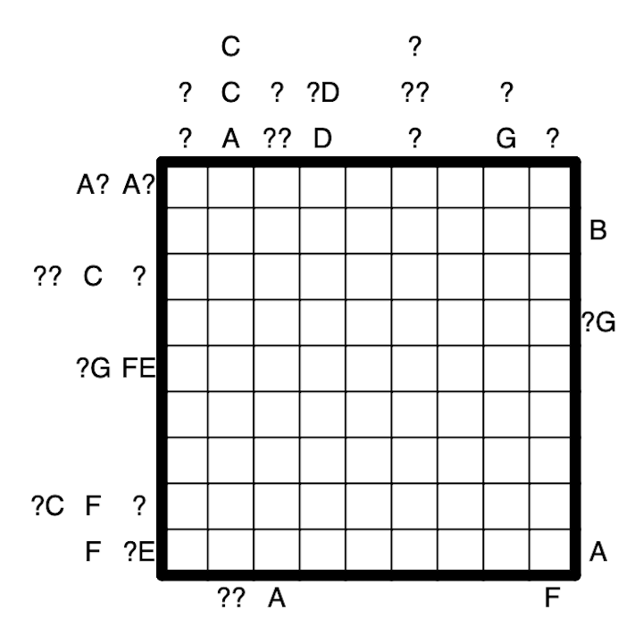 For future solvers, the clue on the right side of row 2 is B instead of G in sudokupad.