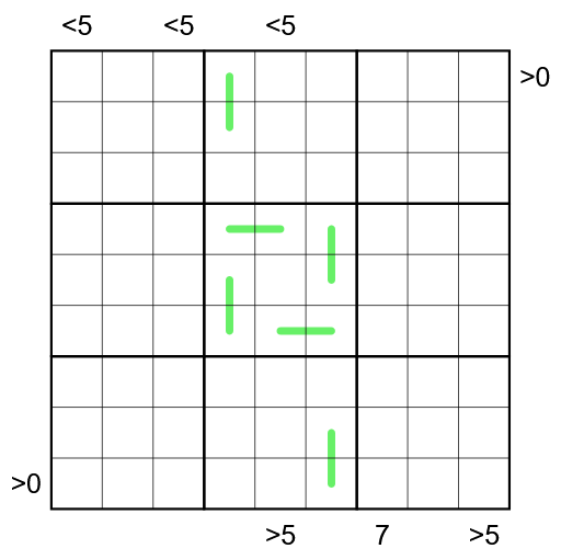 German Whispers: Adjacent digits along a green line must have a difference of at least 5.