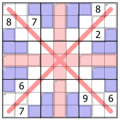 Digits do not repeat along the two marked diagonals.