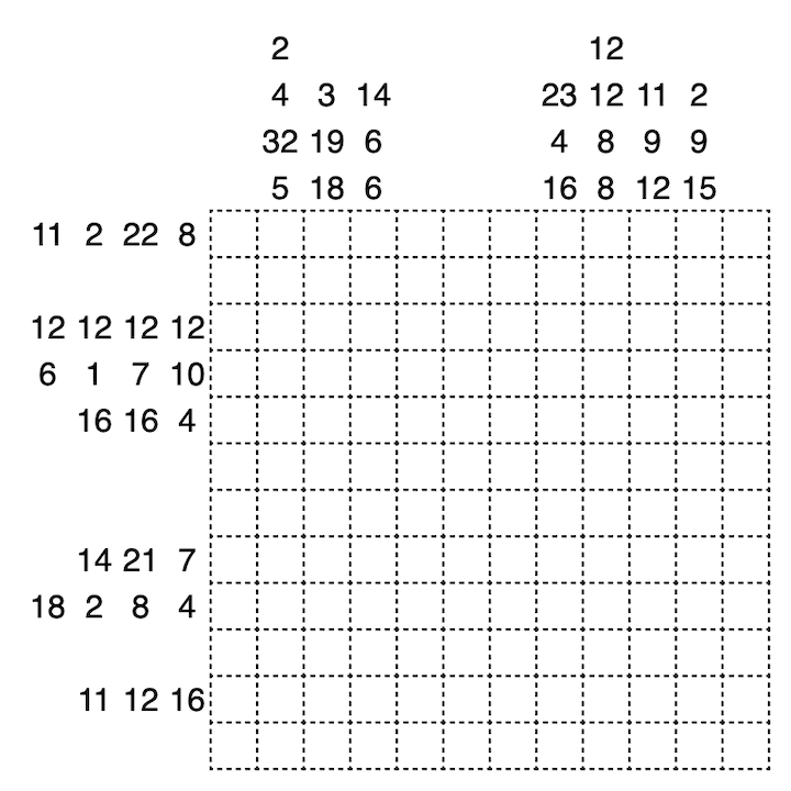 Clues outside the grid indicate the sums of connected groups of numbers in the respective row or column, in order, where empty cells serve as delimeters between groups.