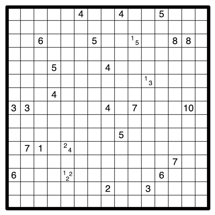 Tapa: Shade some cells such that all shaded cells are orthogonally connected and no 2x2 area is entirely shaded. Cells with numbers indicate the length of consecutive shaded blocks in the surrounding (up to 8) cells, and if there is more than one number in a cell, then there must be at least one unshaded cell or a cell from a different area between the shaded blocks. All cells containing more than one number belong to the Tapa area.