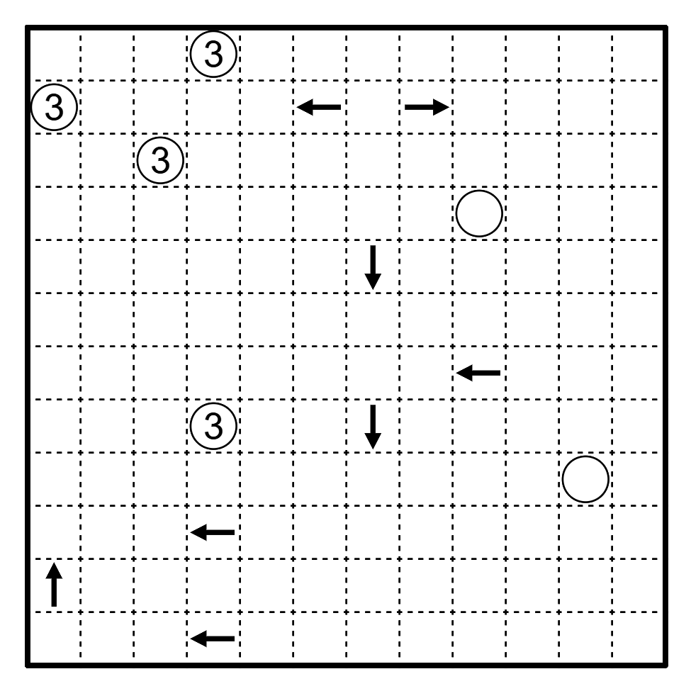 Sashigane: Divide the grid entirely into 1-cell-wide L shaped regions. An arrow must lie at an end of an L and point towards the bend. A circle must lie at the bend of an L, and if one contains a number, it belongs to an L with the given number of cells.