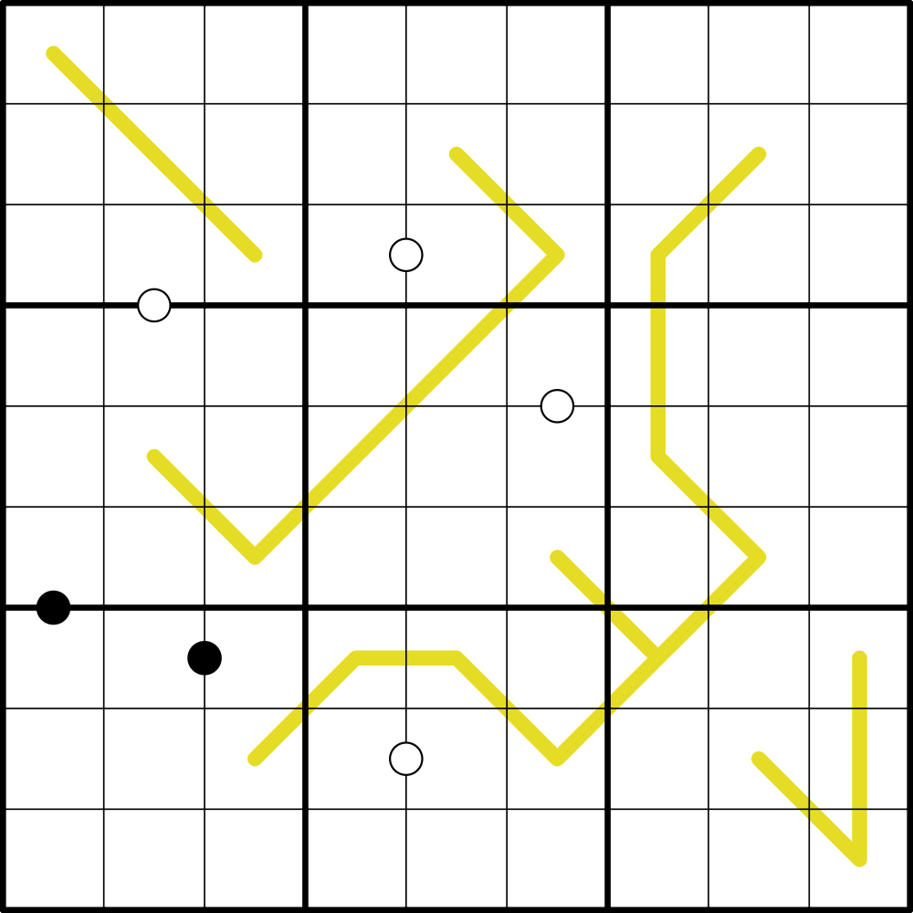 Kropki dots: Digits separated by a black dot are in a 1:2 ratio. Digits separated by a white dot are consecutive Not all possible dots are marked.