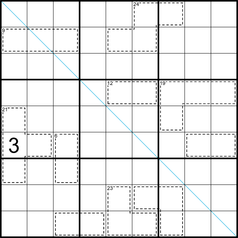 - Killer cages: Digits in cages must sum to the number in the top-left corner (if given) and cannot repeat. Where a number is not given, the cage and its reflected cage both sum to x, where x is to be determined by the solver. To clarify, x is the same for pairs of reflected cages, but not necessarily the same for all unmarked cages.