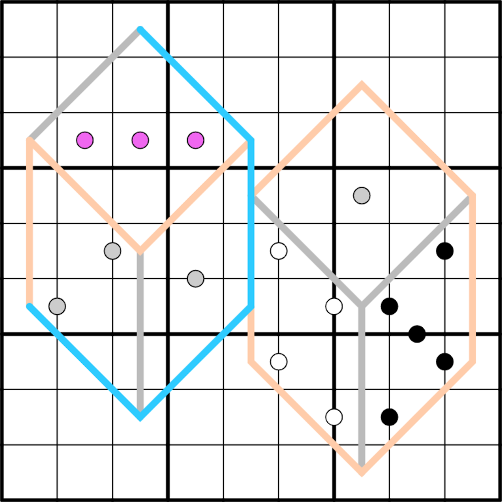 • Along peach lines, any set of three sequential cells must contain a low {1,2,3}, middle {4,5,6}, and high {7,8,9} digit (entropic line).