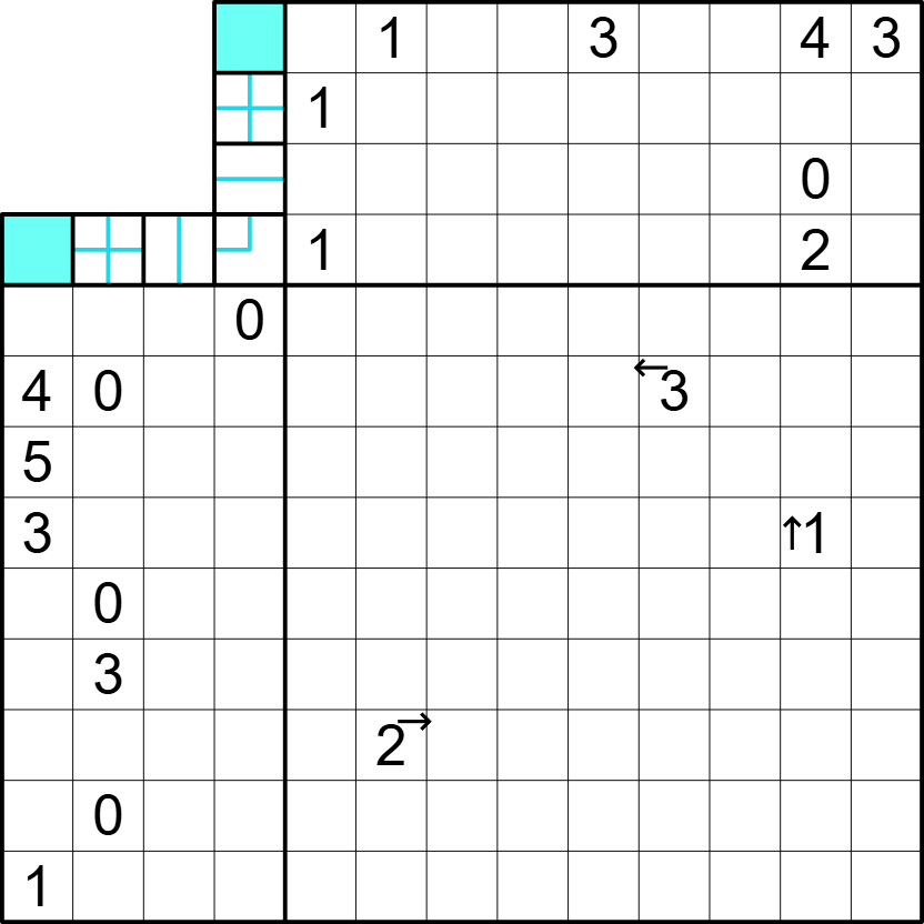 Clues inside the grid are never shaded and count the number of dominoes in the direction of the arrow.