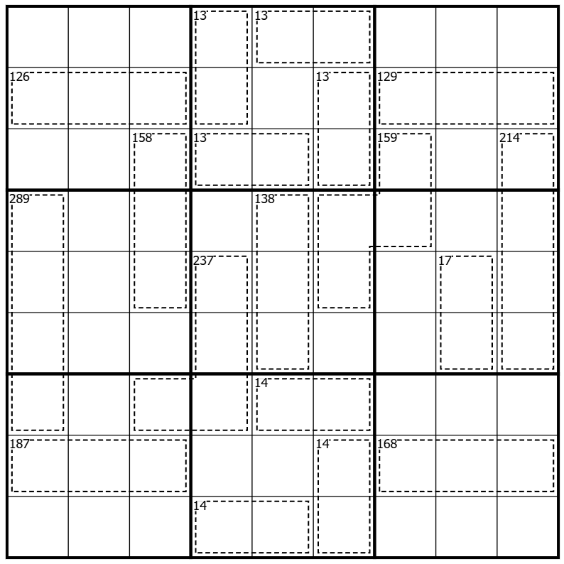 Example: A cage with "123" in the top corner may be a 12-cage including a 3, a 13-cage including a 2, a 23-cage including a 1, or a 3-cage including a 1 and 2.
