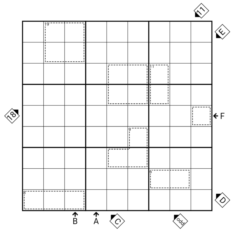 - Diagonal Hole Sandwiches: Clues outside the grid in pointing squares give the sum of values between a black hole and a white hole in the indicated diagonal direction. The sum does not include the bounding holes. If there are more than one black or white hole along that direction, the solver must determine which black hole and which white hole to sum between.