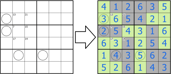 The image below shows a sample 6x6 puzzle and solution with the same rule set.