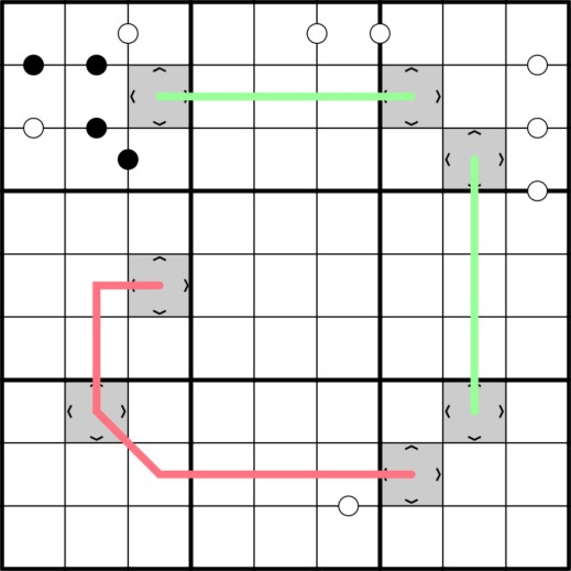 Normal Sudoku rules apply. ANTI-KING- Numbers a chess king's move apart cannot contain the same number. GERMAN WHISPERS- Numbers on green lines are at least 5 apart from their neighbors on the line. DUTCH WHISPERS- Numbers on the red line are at least 4 apart from their neighbors on the line. KROPKI PAIRS- Numbers with a white dot between them are consecutive. Numbers with a black dot between them are in a ratio of 2:1. Not all possible dots are given. MAXIMUMS- Numbers in grey cells with greater than symbols are greater than all 4 orthogonally adjacent cells.