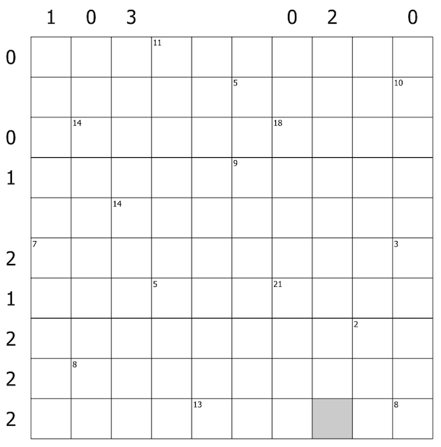 - Clues outside the grid indicate the number of empty cells in the corresponding row/column (empty cells do not contain stations, or network lines). Grey shading indicates that a cell is empty.