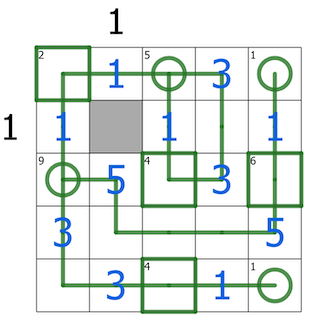- Cells containing a clue in the corner must contain a station and the number indicates the total number of network cells between that station and all other directly connected stations (excluding the stations themselves). Not all clues are necessarily given.