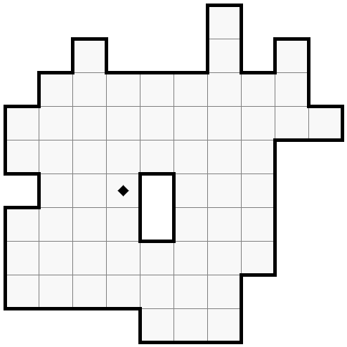 Starting at the black diamond, draw a directed path through the centers of some cells in the grid. Path segments are drawn sequentially from cell to cell, such that the first path segment is drawn from the black diamond to an adjacent empty cell, the second segment is drawn from that cell to the next empty cell, and so on until the final segment is drawn and the path ends.