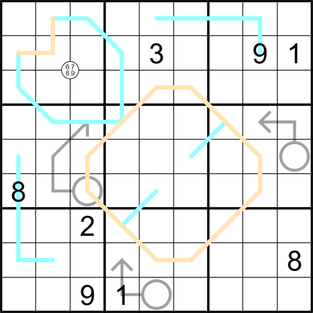 Entropic Lines: Any set of three sequential cells along a peach line must contain a low digit (1,2,3), middle digit (4,5,6) and high digit (7,8,9).