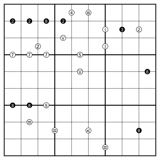 0-8 Sudoku: Fill in the digits 0-8 once each in every row, column and marked 3x3 box.