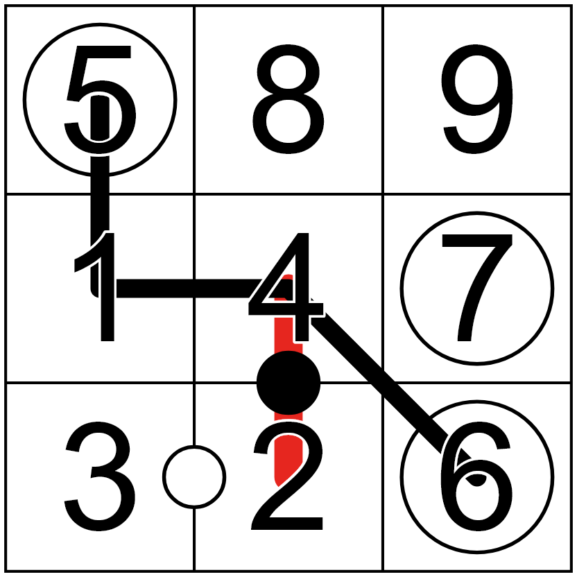 In this example, the red line has a digital root of 6 (2+4 = 6), and the black line has a digital root of 7 (1+4+5+6 = 16, 1+6=7). Both 6 and 7 appear in the circles, and the three circles together have a digital root of 9 (5+6+7 = 18, 1+8=9). 4 is double 2, and 2 and 3 are consecutive.