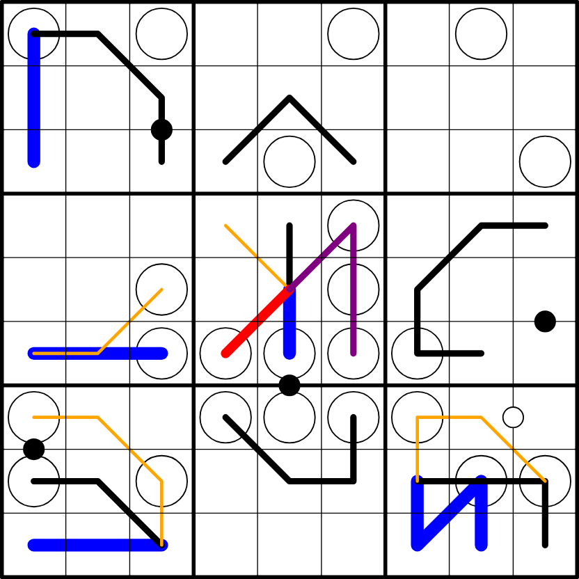 Note that line color or thickness is not relevant and is purely cosmetic. Lines may overlap, even over multiple cells, but are always clearly visible when they do.