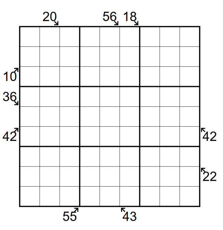 Clues outside the grid are the sum of the first X digits in the corresponding direction. These sums may bounce of the edges of the grid and continue at a 90 degree angle if X is larger than the number of cells in the diagonal.
