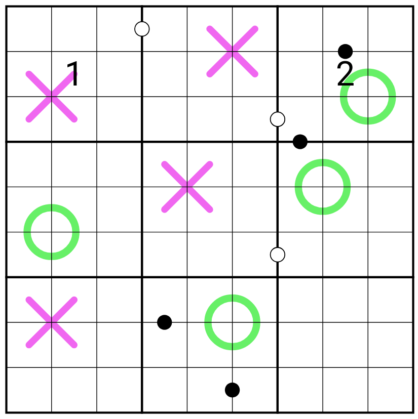 There is either a 4-cell purple "X" or a 4-cell green "Circle" in box 9 (the lower right box in the grid) It up to the solver to determine which player wins the Tic-Tac-Toe game. Player 1 (purple), or Player 2 (green). There is only one solution.